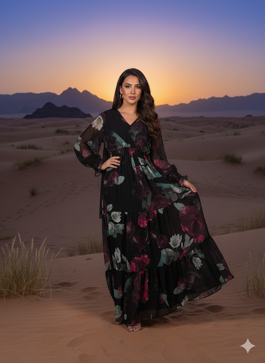This beautiful Radiant Flora maxi dress is perfect for your special days. It has a stylish front with frill detailing that adds a trendy touch. The flowing frill design moves elegantly, and the cute puffy sleeves give it a lovely, feminine look. It's a great choice for any occasion!