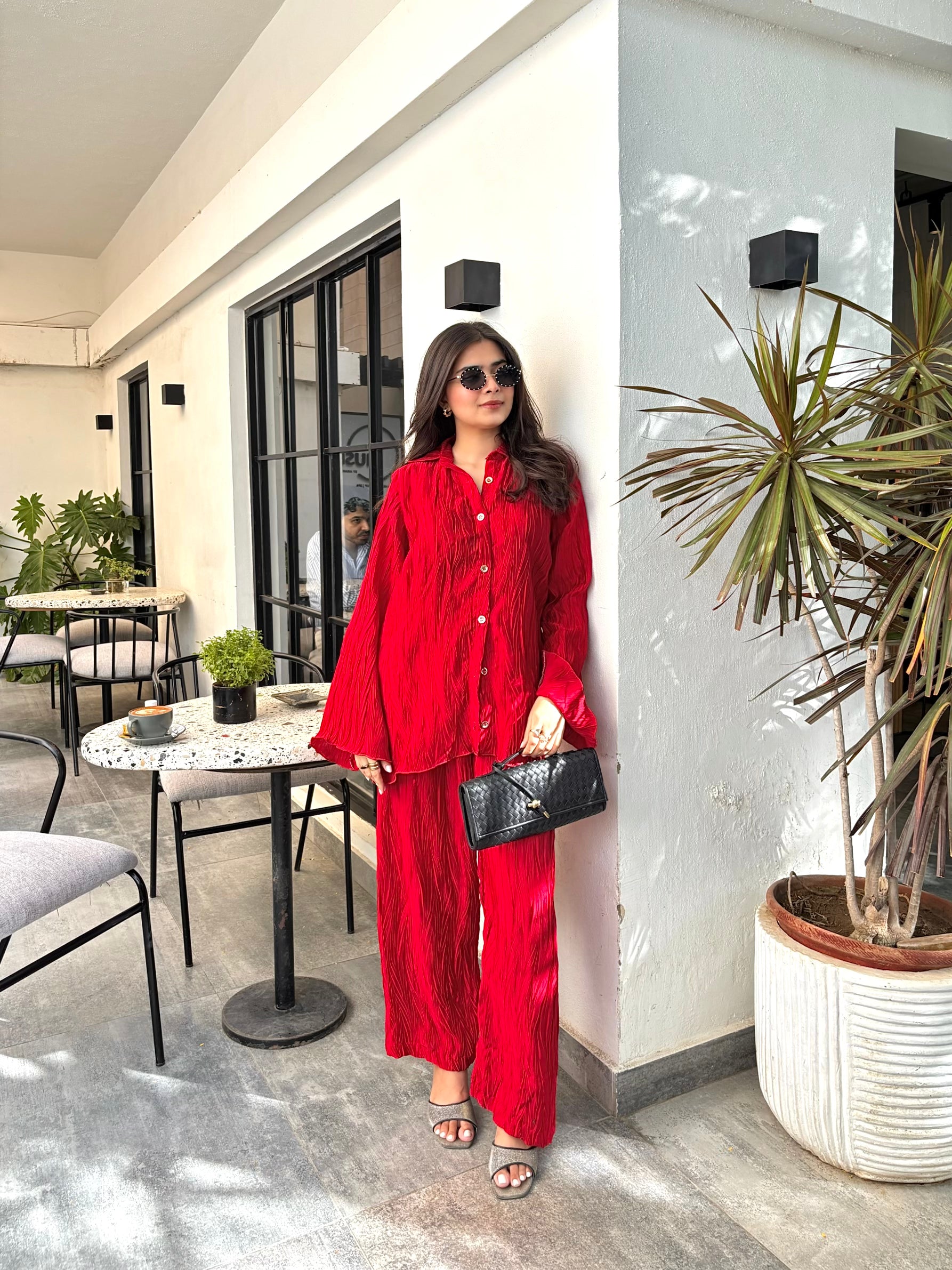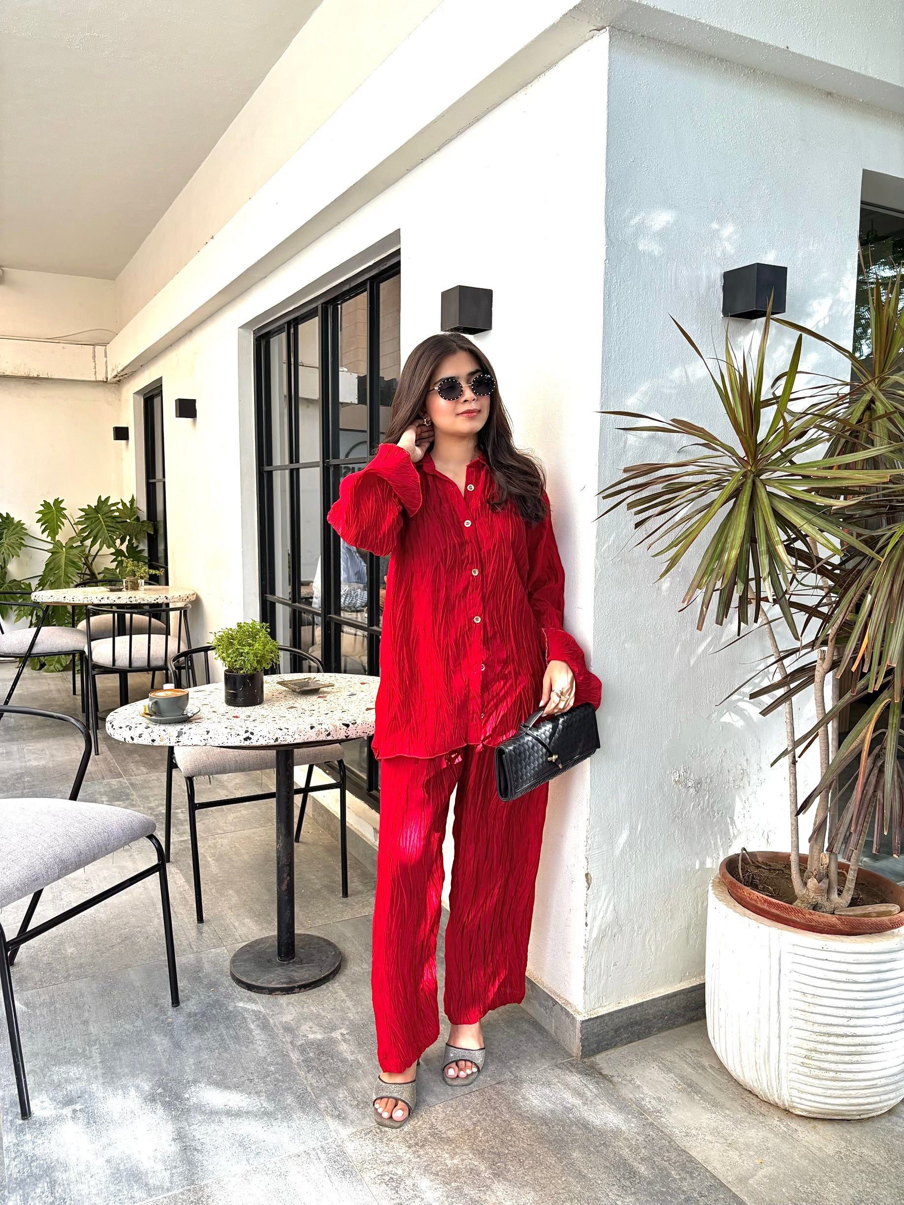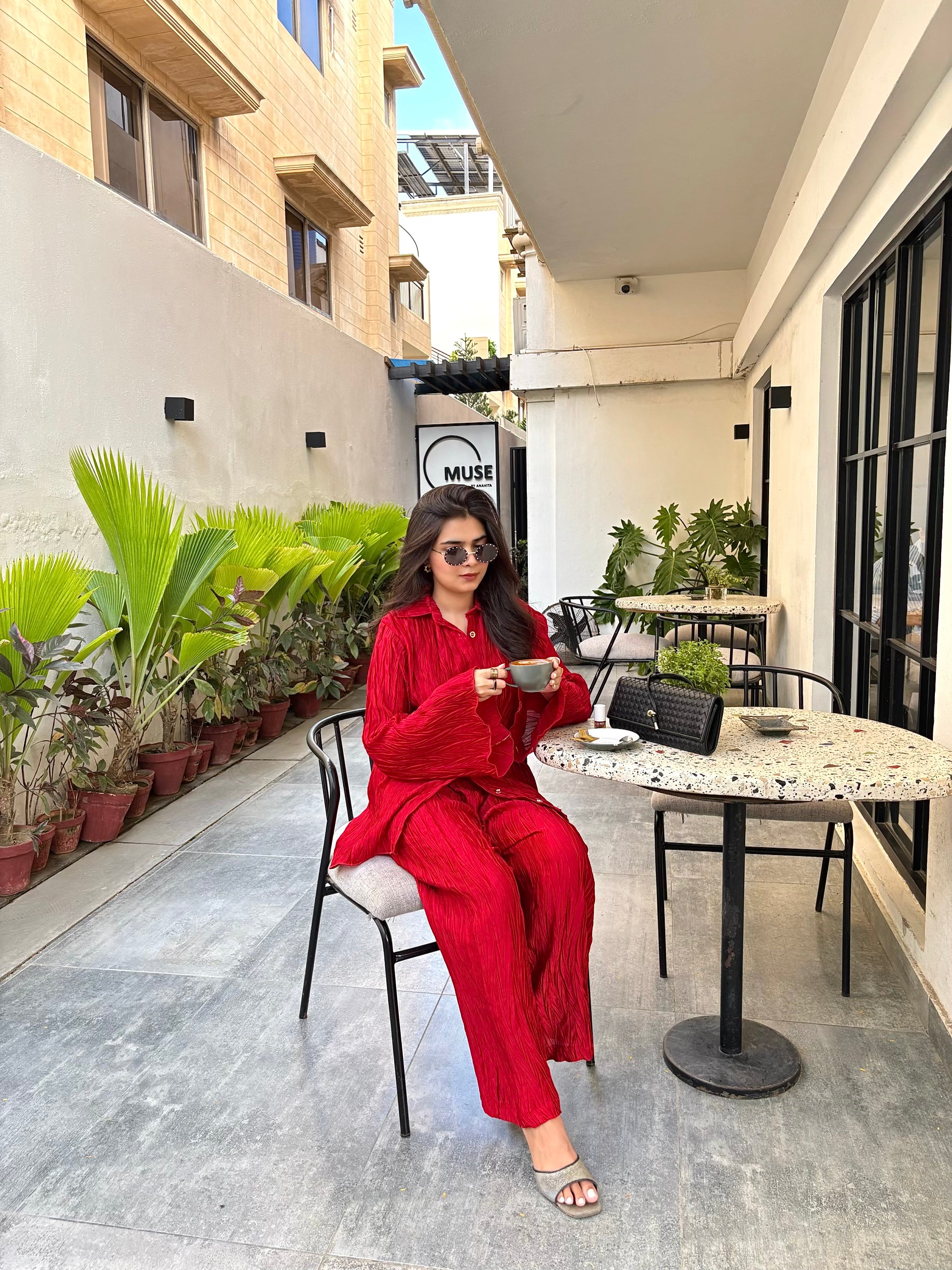 Introducing our gorgeous "Red Ruby" co-ord dress in a stunning crinkle fabric. This dress comes with matching pants and is perfect for any occasion. The vibrant red color adds a touch of elegance and sophistication to your look. Step up your style game with this simple yet eye-catching ensemble.